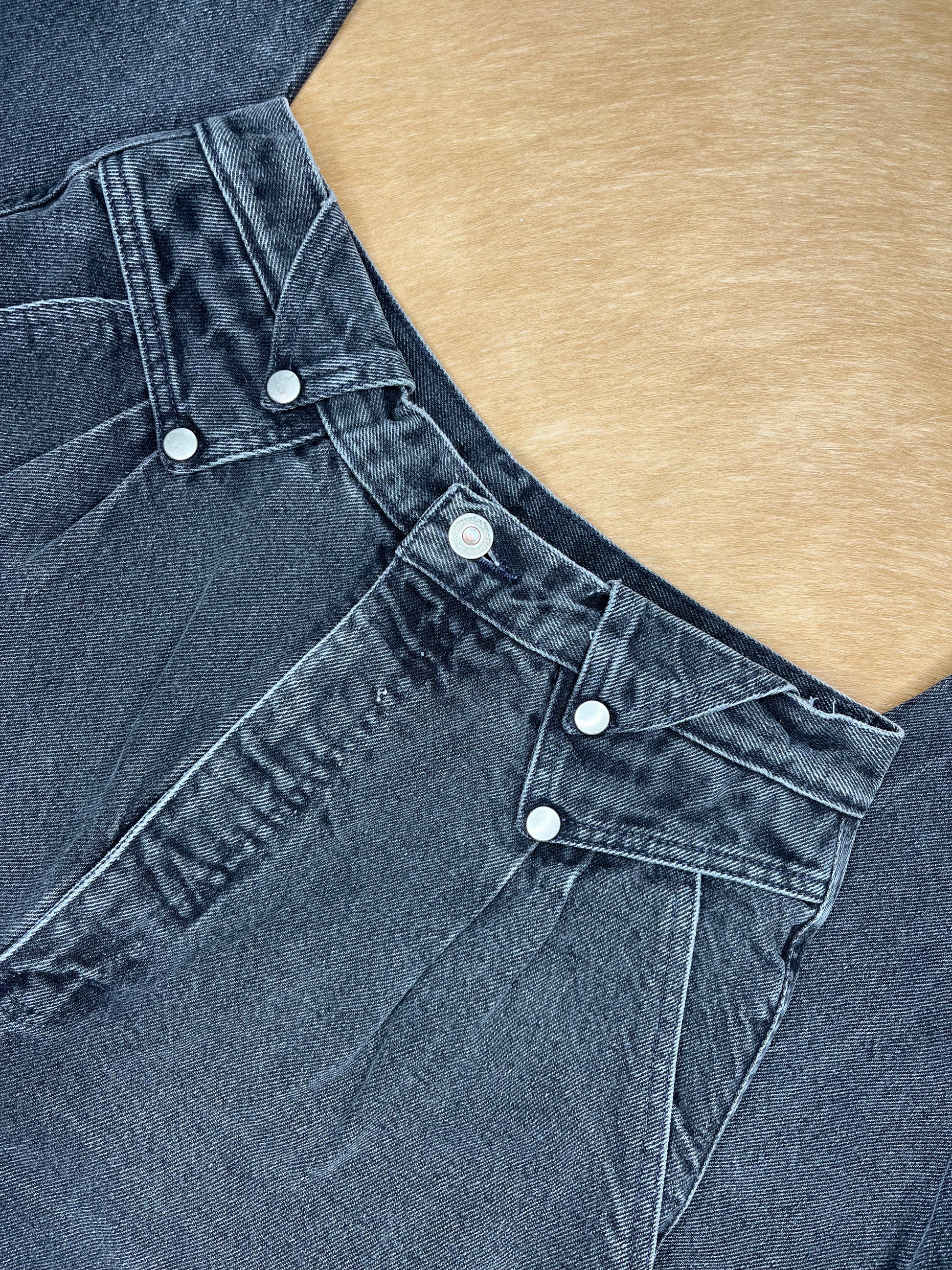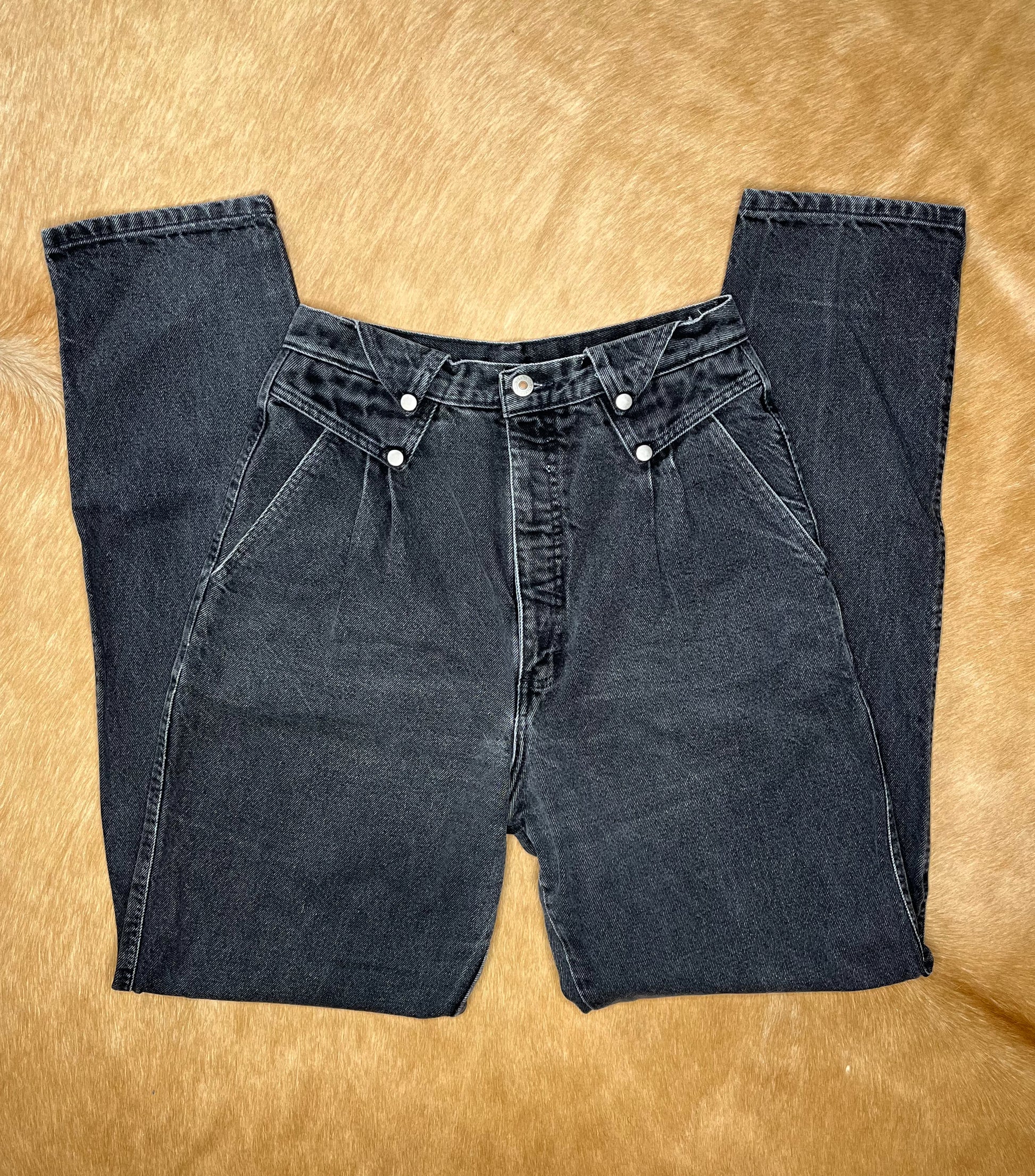 Black vintage bareback Wrangler Silverlake jeans with fold-over and button details on the front yoke. Measures: 29" waist, 15" rise, 48" hips, 36" inseam.
