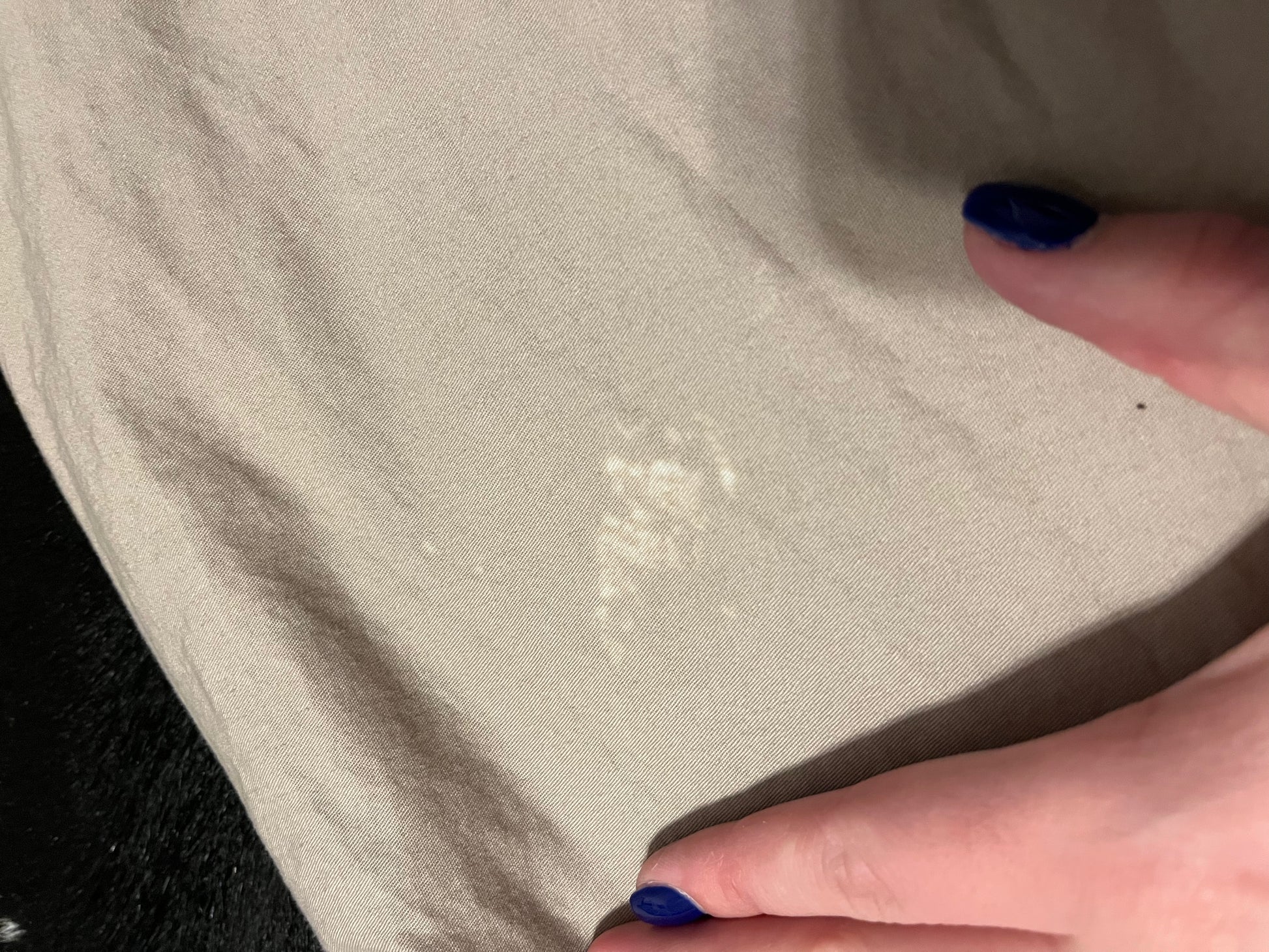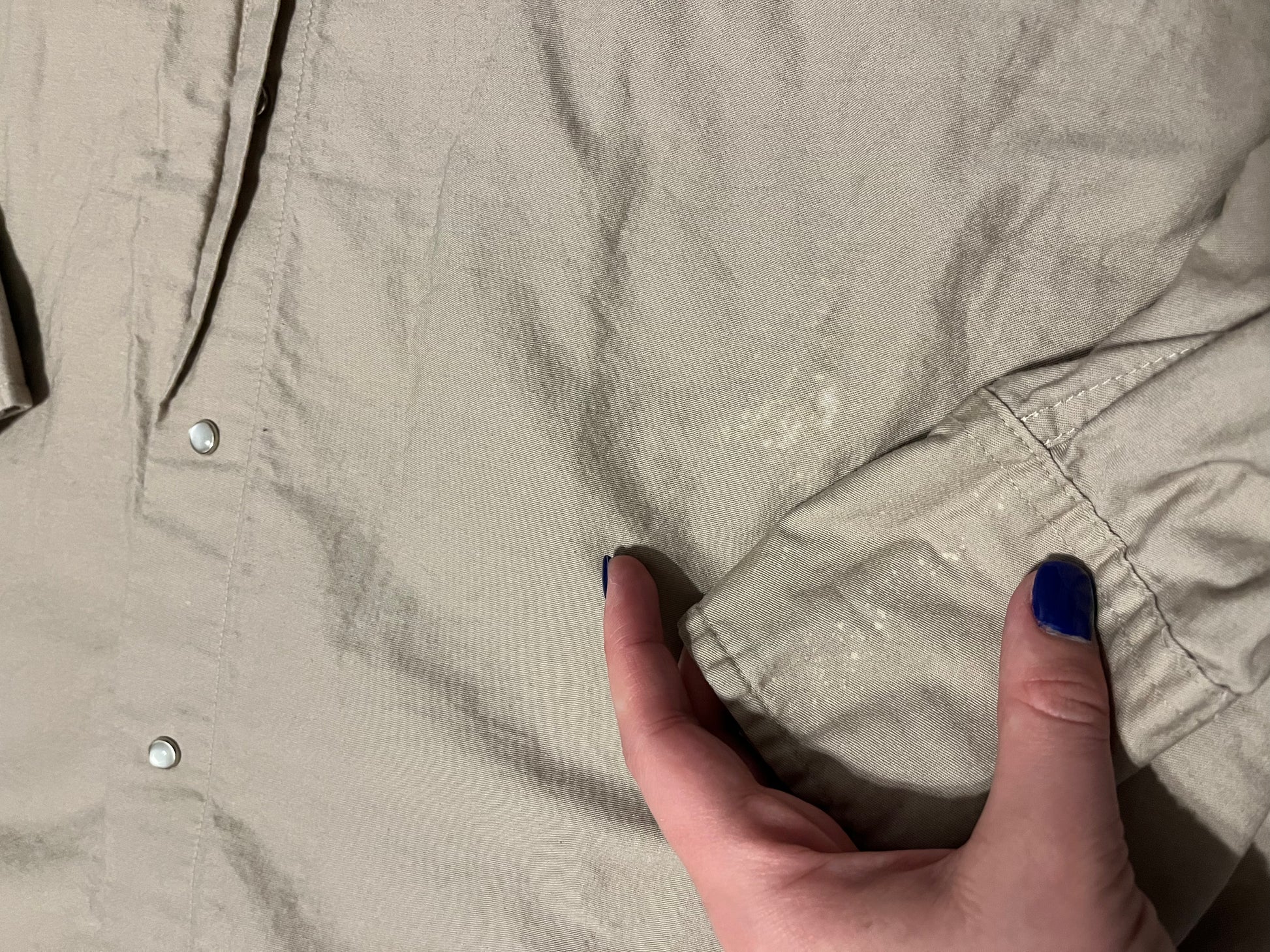 Bleach stains on front and cuff, pictured and priced accordingly.
