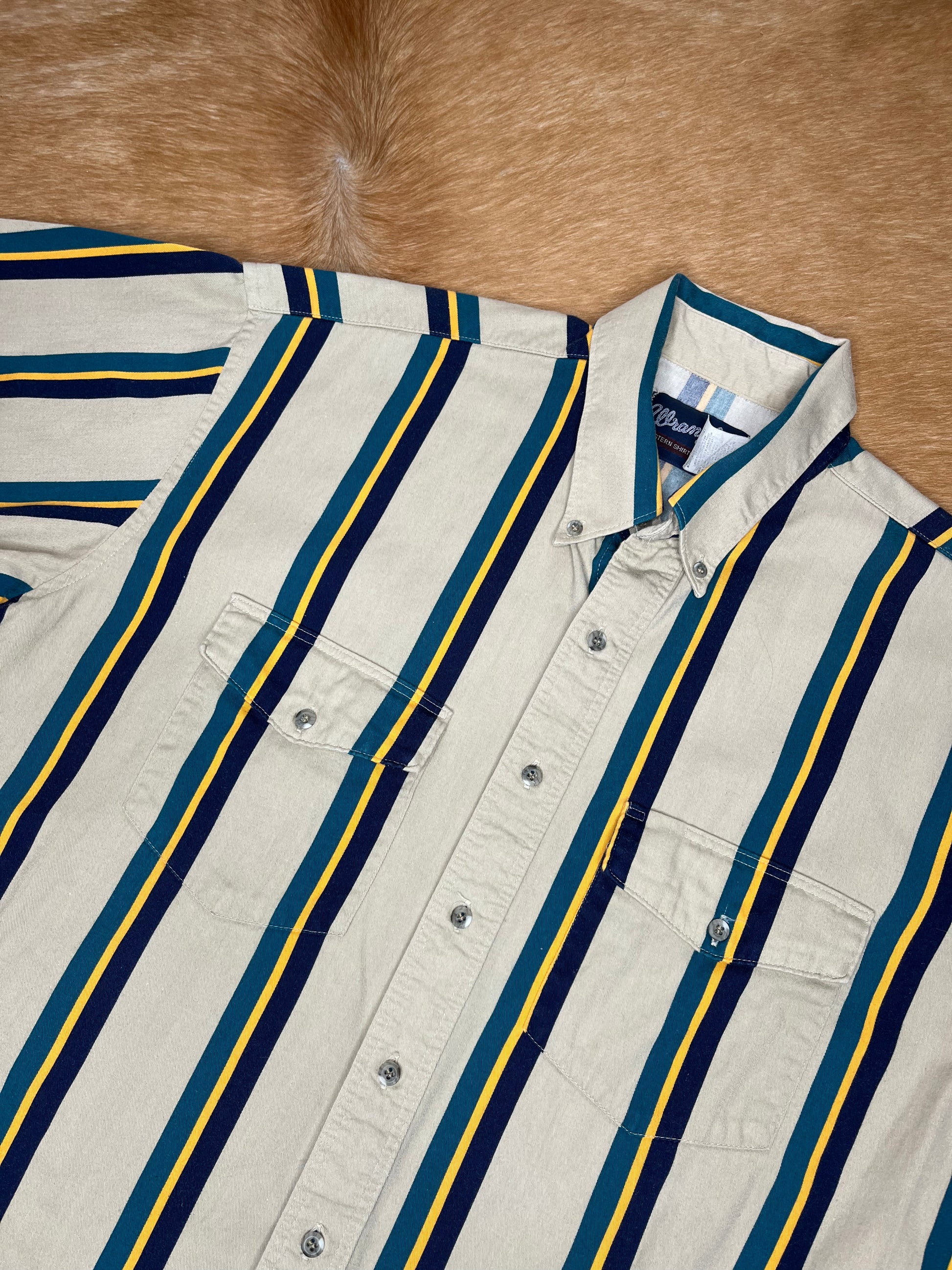 Men's Wrangler short sleeve khaki button up with green, navy, and yellow stripes. Measures 27" flat, from pit to pit.