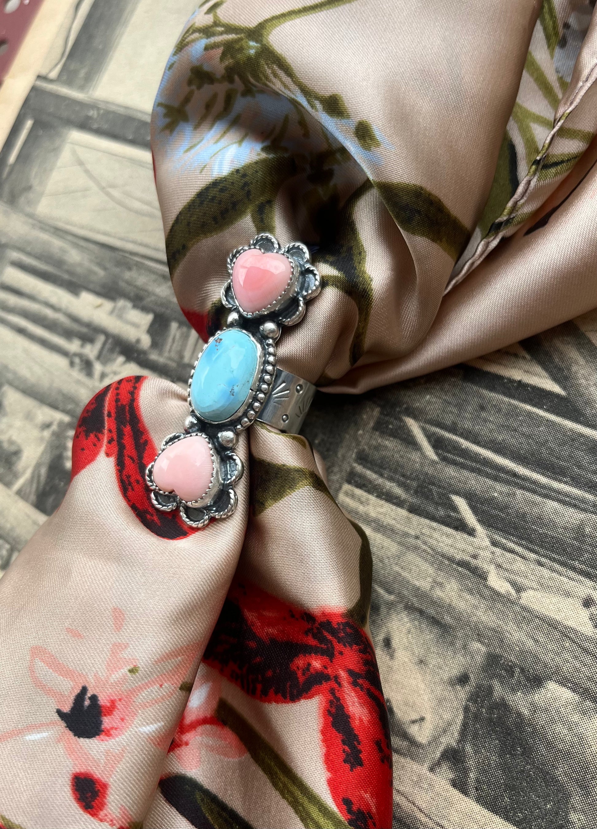 Stunning pink conch and Golden Hill turquoise sterling silver ring, size 7. Because of the thickness of the band, fits a size 6. Non-native made, handmade in the USA. Stamped AC, MWW and STERLING.