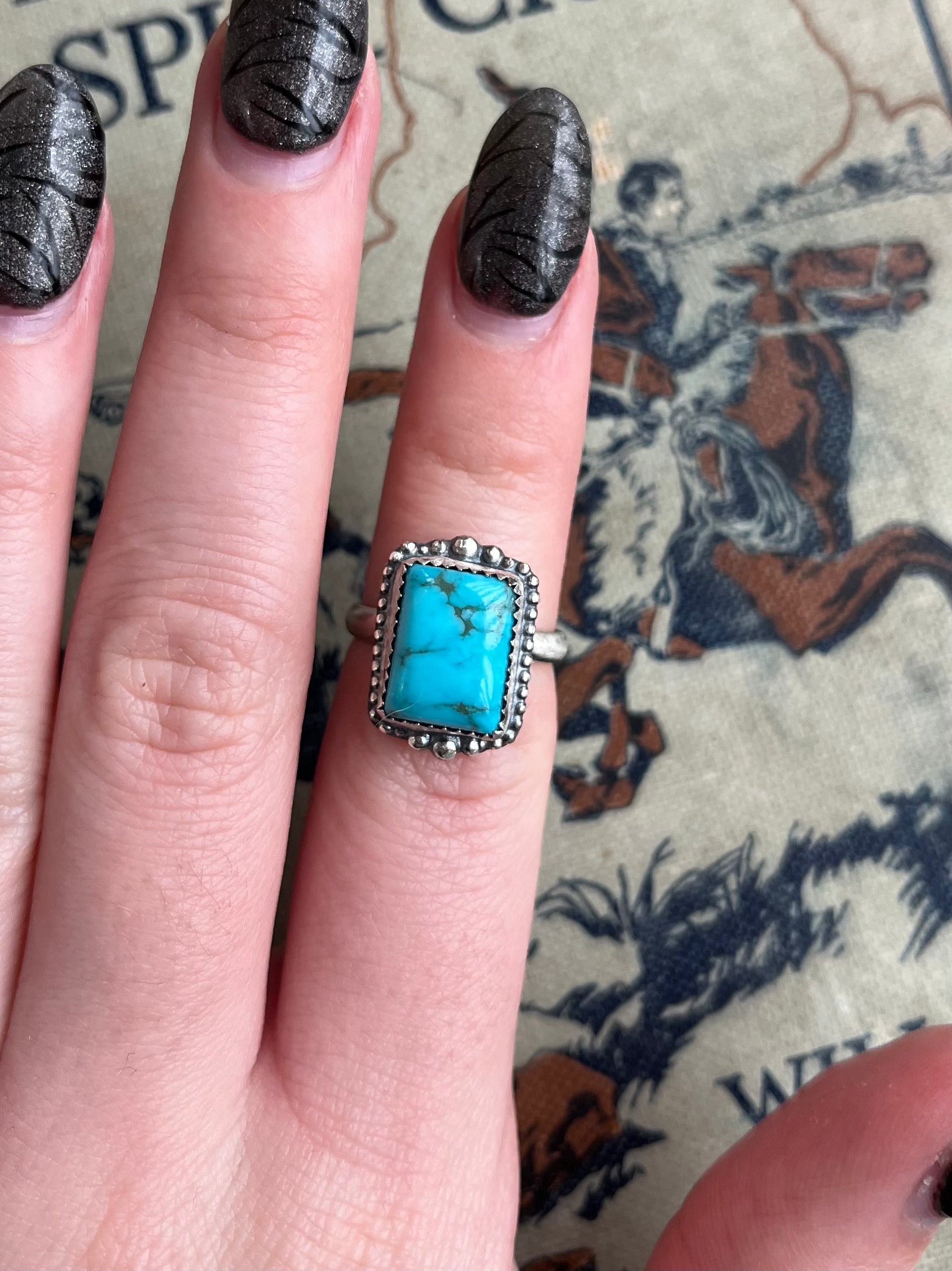 Stunning Sonoran Gem turquoise and sterling silver size 5 ring. Non-native made, handmade in the USA. Stamped AC and STERLING.
